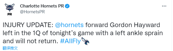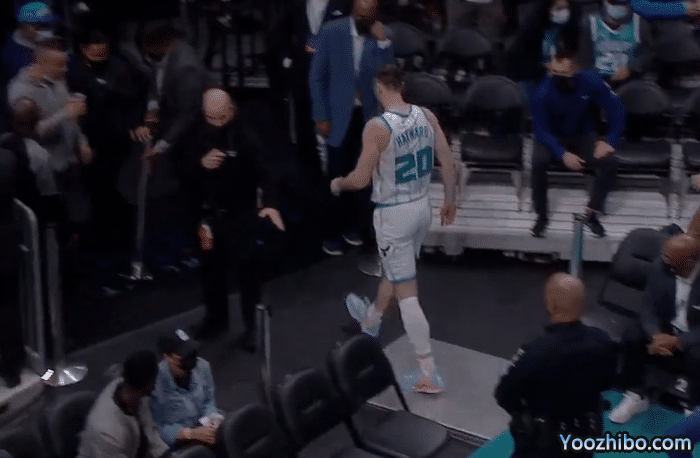 黄蜂和猛龙比赛第一节,海沃德站在禁区附近,被倒地的特伦特压伤脚踝,站着不动也躺枪,海沃德真是太不幸了,之后海沃德一瘸一拐离场并且返回更衣室,经过初步检查,黄蜂官方宣布,海沃德左脚踝扭伤,退出本场比赛。