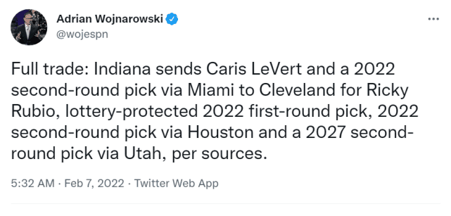 JRS直播02月07日讯 ,据名记沃纳罗斯基报道,骑士和步行者达成了一笔4换2的交易,骑士送出卢比奥、2022年乐透保护的首轮签、2022年的次轮签(来自火箭)和2027年的次轮签(来自爵士),得到步行者的勒维尔和2022年的次轮签(来自热火)。