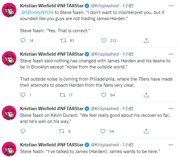 谈到关于哈登的交易流言,纳什说:“球队和哈登双方都想要继续合作下去,哈登也表示自己想留在篮网,而其他的说法都只是外界的噪声罢了。而这些噪声都来自76人那边,因为他们已经明确表示过他们想要从篮网挖走哈登。