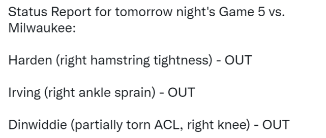 JRS直播讯北京时间6月15日,篮网官方宣布,哈登(右腿筋紧张)、欧文(右踝扭伤)、丁威迪(右膝部分韧带撕裂)都将缺席篮网和雄鹿的系列赛G5。这意味着天王山之战,欧文和哈登都不会打,而杜兰特将成为三巨头中唯一可以出战的球星。