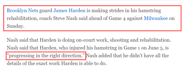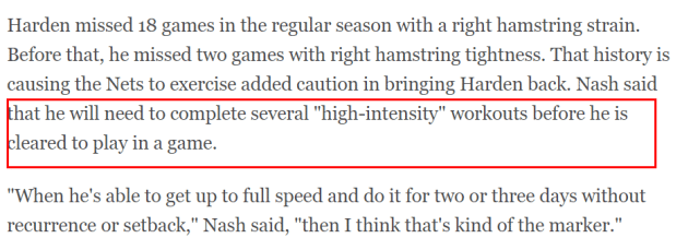 哈登因右腿筋拉伤缺席了常规赛的18场比赛,而在那之前,他还因为右腿筋紧张缺席两场比赛。这段伤病史,让篮网对待哈登的伤情更加谨慎。纳什说,哈登需要完成几次“高强度”的训练,才能复出参赛。“当他有能力全速前进,并坚持两三天没有复发后,我才认为那是(可以复出)的标志了。”
