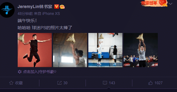 JRS直播讯 今天是农历五月初五端午节,端午节是集祈福辟邪、欢庆娱乐和饮食为一体的民俗大节。就在今天,北京首钢球星林书豪在社交媒体上发文和球迷们互动,他晒出了多张球迷们PS的照片,里面林书豪持球变成了拿粽子,非常符合节日气氛。林书豪配文:“端午快乐!哈哈哈 球迷PS的照片太棒了。”