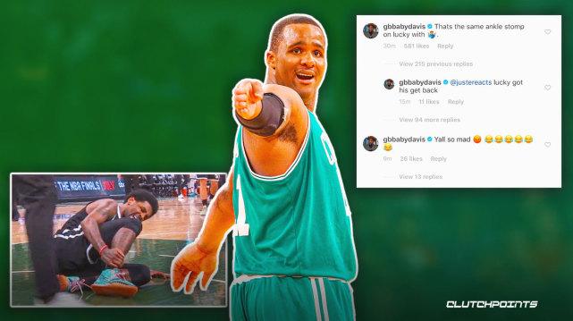 在欧文受伤后,“大宝贝”戴维斯似乎有些幸灾乐祸,他在社交媒体上表示,LUCKY(绿军的LOGO)让欧文付出了代价,当很多球迷谴责戴维斯不应该在欧文出现伤病的时候发表这样的言论,不过戴维斯丝毫不认错,他表示,欧文受伤的脚踝正是踩绿军LOGO的脚。
