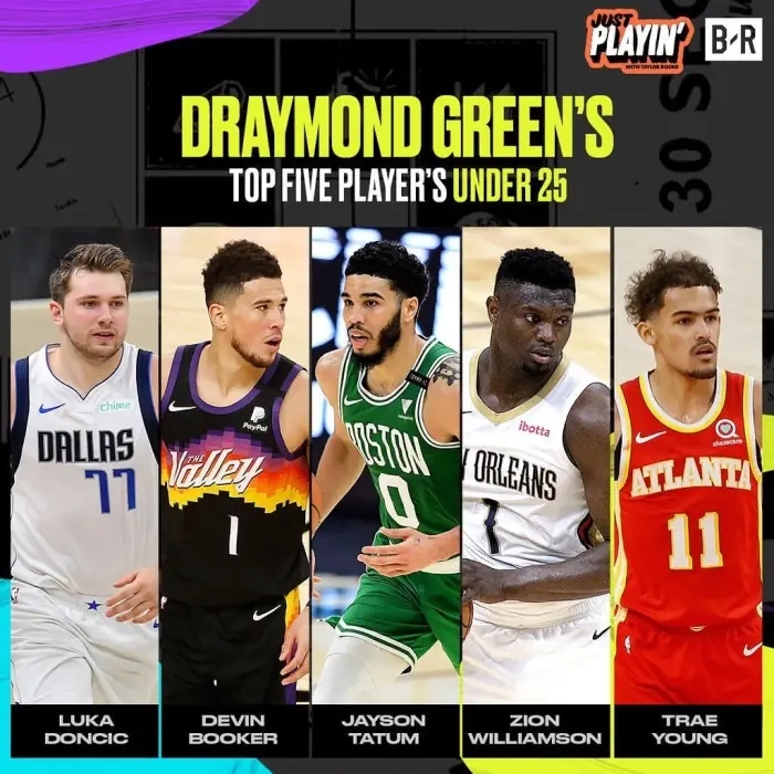 JRS直播讯北京时间6月10日,追梦格林今日参加《Just Playin》节目时选出了他心目中现役25岁以下球员中的TOP5,东契奇领衔这个榜单!