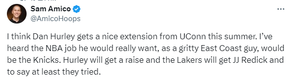 目前关于湖人新帅的流言有很多,名记Sam Amico表示:我认为丹-赫尔利今年夏天会从康涅狄格大学获得一份不错的续约合同。我听说他真正想要执教的球队是尼克斯,赫尔利将获得加薪,而湖人将聘请雷迪克,至少他们已经努力了。