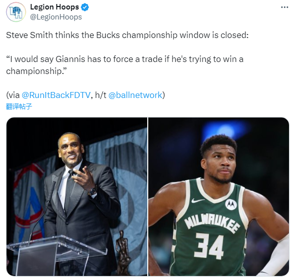 近日前NBA球员史蒂夫-史密斯认为雄鹿的夺冠窗口期已经关闭:如果字母哥想要再次赢得总冠军,他必须强制申请离队。