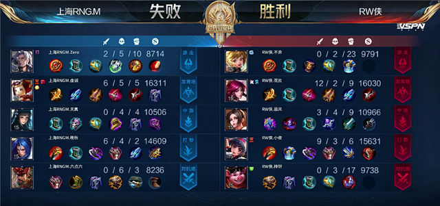 57秒下河道交火,不知火舞拿下一血。2分11秒橘右京拿下暴君。3分钟不知火舞被击杀。6分36秒橘右京拿下暴君。6分40秒娜可露露拿下主宰。7分钟W侠下路一塔被破。7分30秒娜可露露推掉下路一塔。8分20秒娜可露露推掉上路一塔。8分48秒鲁班七号推掉中路一塔。10分钟鲁班七号推掉中路二塔,团战RW侠打出1换2。10分55秒伽罗拿下暴君。11分30秒野区团战,RW侠团灭上海RNG.M,娜可露露拿下三杀。12分50秒娜可露露拿下主宰。13分钟野区团战,RW侠打出0换3。13分30秒RW侠推掉中路高地。13分55秒野区团战,上海RNG.M团灭RW侠,鲁班七号拿下三杀。15分钟上海RNG.M推掉RW侠中路高地塔。15分10秒下河道团战双方2换2。15分47秒暴君团,上海RNG.M团灭RW侠,猪八戒拿下暴君。17分15秒上海RNG.M拿下主宰,廉颇被击杀。19分15秒下路团战,RW侠打出0换2。RW侠顺势中路一波直上高地,20分钟RW侠团灭上海RNG.M攻破水晶拿下本场比赛胜利。