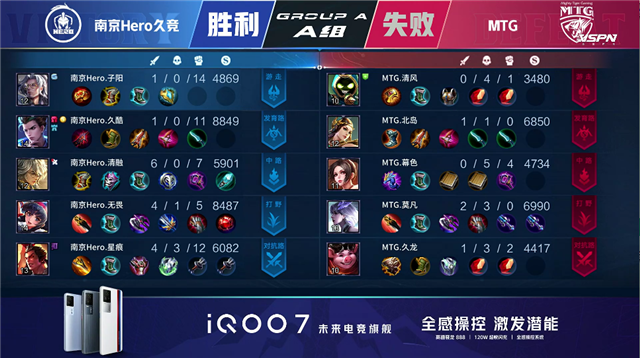 2分14秒,MTG拿下暴君,南京Hero拿下先知主宰。2分48秒,中路团,MTG打出1换2,嬴政拿下双杀。6分50秒,南京Hero破掉MTG上二塔。7分08秒,河道团,南京Hero击杀盾山。7分58秒,南京Hero破掉MTG下一塔。10分45秒,双方团战1换1。12分20秒,MTG拿下暗影暴君,随后南京Hero兰陵王拿下暗影主宰。14分40秒,南京Hero破掉MTG下二塔。16分钟,MTG击杀兰陵王。16分42秒,MTG拿下暗影主宰,南京Hero拿下暗影暴君。19分39秒,南京Hero下路击杀澜。20分36秒,MTG破掉南京Hero中一塔。21分58秒,南京Hero沈梦溪与兰陵王再次击杀澜。25分04秒,南京Hero抢到风暴龙王,随后团战南京Hero打出0换5团灭对手。25分43秒,南京Hero下路平推破掉MTG水晶拿到赛点。