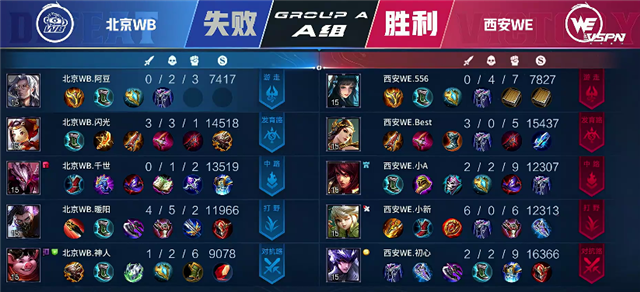 开局北京WB换线,廉颇走中路,公孙离走上路。1分10秒野区团战,公孙离拿到一血,团战中西安WE打出1换2。2分30秒西安WE拿下暴君。2分55秒老夫子在下路被击杀。4分10秒不知火舞被击杀。4分40秒西安WE推掉上路一塔。6分16秒北京WB强推下路一塔,团战西安WE打出1换4。6分50秒西安WE推掉中路一塔。7分25秒裴擒虎拿下暴君。7分36秒下路团战,马可波罗被击杀。8分10秒中路团战,双方打出1换1。9分钟西安WE入侵野区,赵云被击杀。9分43秒西安WE推掉上路二塔。10分17秒裴擒虎拿下暴君。10分47秒西安WE推掉下路二塔。11分46秒裴擒虎推掉中路二塔。12分15秒野区团战,西安WE打出1换2。12分48秒北京WB中路高地塔被破。13分35秒裴擒虎拿下主宰。14分钟野区团战,北京WB打出0换4,公孙离拿下双杀,西安WE推掉下路高地塔。14分41秒赵云拿下暴君。15分钟北京WB推掉中路一塔。17分30秒中路河道团战,西安WE团灭北京WB,裴擒虎拿下双杀。18分07秒西安WE攻破水晶拿下本场比赛胜利。