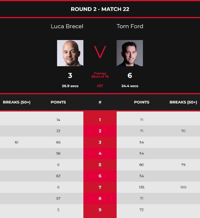 本场比赛,汤姆-福德凭借1杆70+,以71-14和71(70)-22先胜2局,大比分2-0领先。此后,布雷切尔打出1杆60+,以65(61)-54和56-54连扳2局,大比分2-2进入中场休息。