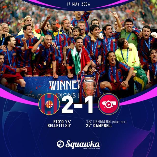 阿森纳在决赛早段先有莱曼被逐,但仍凭坎贝尔先开纪录得以半场领先。下半场巴塞罗那倾力反扑,完场前终凭埃托奥追成平手,数分钟后贝莱蒂更射入一球为巴塞罗那反胜2-1,夺得球队的第二个欧冠宝座,亦是继1992年决赛14年后再度封王。