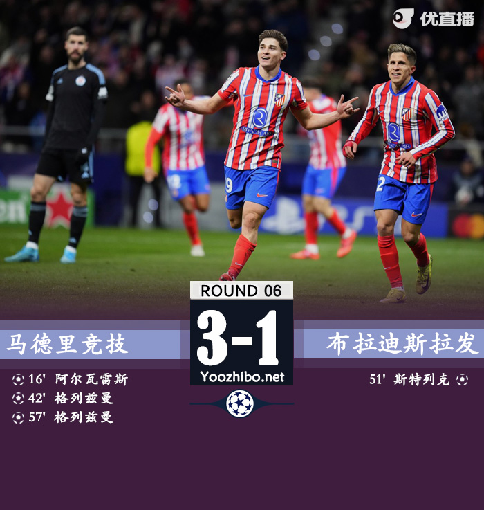 JRS直播讯 北京时间12月12日凌晨1时45分,2024-25赛季欧冠联赛阶段第6轮在利雅得航空大都会球场展开角逐,马德里竞技主场迎战布拉迪斯拉发。上半场阿尔瓦雷斯世界波+欧冠6场4球,格列兹曼连续5场破门,下半场斯特列克点射扳回一城,格列兹曼连场双响+5场7球。最终马竞主场3-1战胜布拉迪斯拉发,马竞豪取各赛事10连胜。积分榜方面,马竞积12分升至第10名,距晋级区一步之遥。