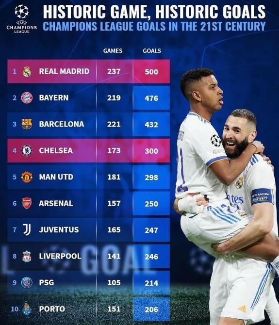 JRS直播04月14日讯 北京时间今天,德转统计了21世纪各球队欧冠进球数,皇马500球高居第一位。拜仁、巴萨位列二三名。