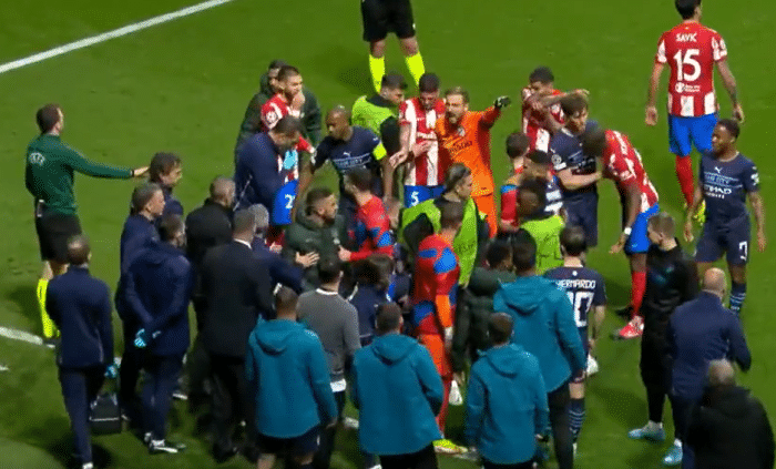 而双方的冲突也一直持续到赛后的球员通道。双方爆发大规模口角,福萨里科还朝拉波尔特扔东西。曼城球员也在安保的护送下离场,可以说是本赛季欧冠最不和谐的一幕。赛后,很多网友批评马竞,称通过这两场比赛,看到了马竞并不是铁血,而是真的太脏了。