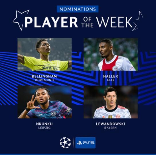 JRS直播9月16日讯 本周的欧冠赛事已经全部结束,欧足联今天公布了周最佳球员的候选名单,贝林厄姆、莱万多夫斯基、阿莱和恩昆库均入选。