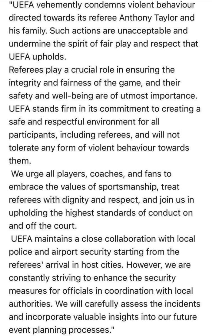 而欧足联也发表了官方声明,谴责针对裁判安东尼-泰勒及其家人的暴力行为,并且呼吁为包括裁判在内的所有足球从业者,提供一个安全且尊重他们的环境:”我们不会容忍任何针对他们的暴力行为。”