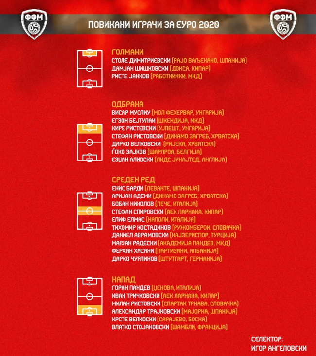 中场:阿里扬-阿德米(萨格勒布迪纳摩)、恩尼斯-巴尔迪(莱万特)、斯特凡-斯皮洛夫斯基(拉纳卡AEK)、博班-尼克洛夫(莱切)、提赫米尔-科斯塔迪诺夫(卢森比洛克)、富尔汗-哈萨尼(地拉那柏迪辛尼)、埃利夫-埃尔玛斯(那不勒斯)、丹尼尔-阿维拉莫斯基(开塞利体育)、达科-科林诺夫(斯图托特)、马扬-拉德斯基(潘多夫学院)