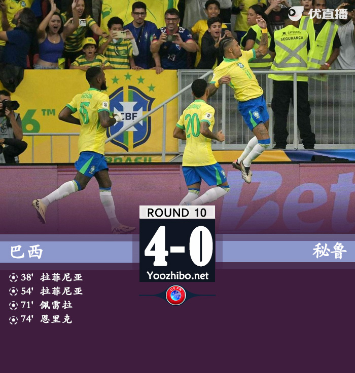 JRS直播讯 北京时间10月16日8:45,世预赛南美区第10轮,巴西主场迎战秘鲁。上半场拉菲尼亚射中横梁,桑布拉诺手球,拉菲尼亚点射命中,巴西暂1-0秘鲁;下半场萨维尼奥造点,拉菲尼亚点射再进,本场比赛双响,佩雷拉精彩凌空破门,恩里克破门,最终巴西4-0秘鲁,10轮过后积16分,积分追平乌拉圭。