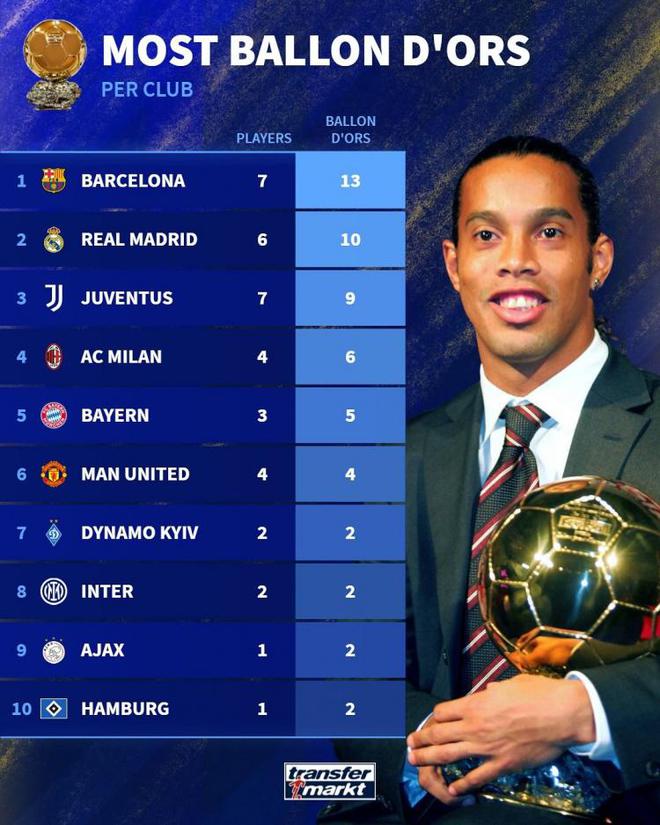 JRS直播讯德国转会市场统计了各俱乐部球员获得金球的数量,并列出榜单,巴萨以13座金球居首,皇马10座金球次席。
