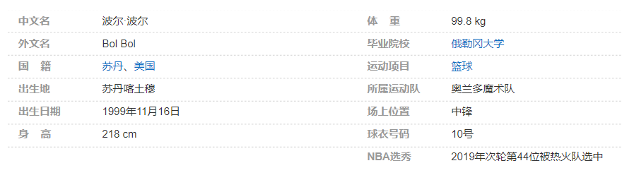 波尔-波尔(Bol Bol),1999年11月16日出生于苏丹喀土穆(Khartoum, Sudan),拥有苏丹/美国双重国籍,职业篮球运动员,司职中锋,效力于NBA奥兰多魔术队。